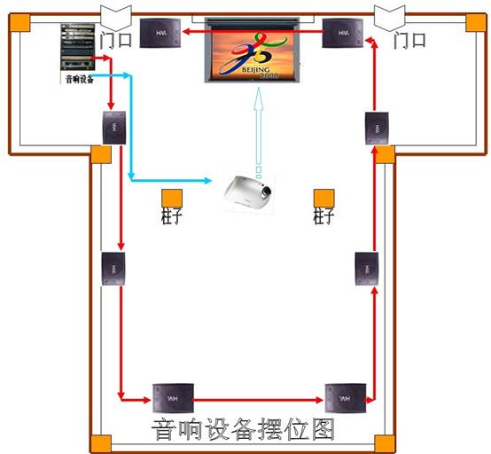 设备的摆位以及吊挂位置,在经常的三次的换位之后才让客户满意.由于甲方的要求比较特殊,在安装完之后,客户要求调换音箱位置,因为根据现场的开会人员来调试声场效果,所以惠威工程师们又根据现场的实际声场要求,从新改换了音箱位置 而且是三次不同的调换,调换之后的音像图: