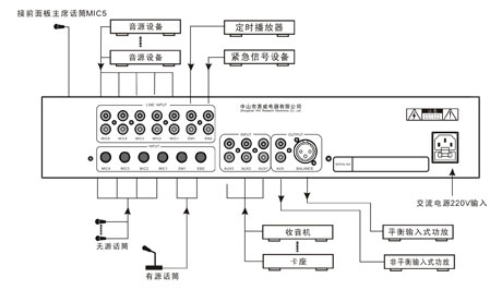 2、5路话筒均有辅助输入口,也可作为线性输入